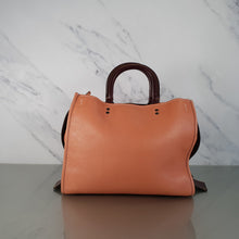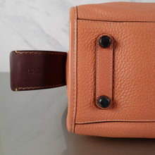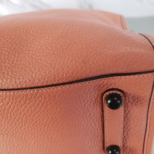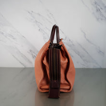 This is the classic Rogue 31 in Coach' beautiful color "Melon" which is probably best described as a salmon like pink color. This bag features gorgeous dark burgundy suede in the outer pockets and burgundy details around zipper and handles. The hardware is black copper which looks gorgeous with this color combination.