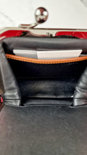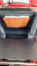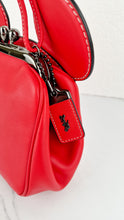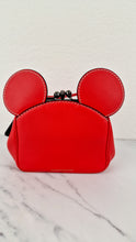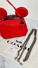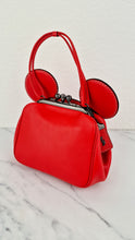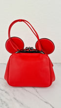 This is the absolutely adorable limited edition kisslock bag in smooth glovetanned red leather with Mickey Mouse ears from the Disney x Coach collection. It features shiny gunmetal hardware and black leather lining. It has two large compartments and inside one is a small flat pocket. You can carry it as a handbag with the short handle or as a crossbody or shoulder bag with the long detachable chain crossbody strap. Inside, you will find the Coach creed patch with the style number of the bag on it. It comes with its matching red 1941 hangtag.