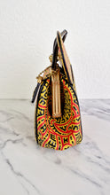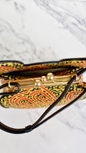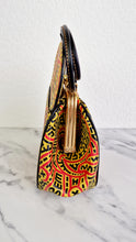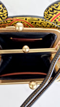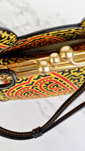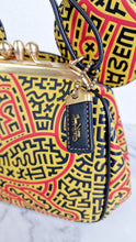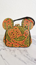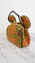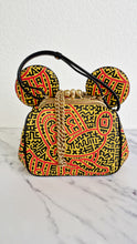 This is the absolutely adorable limited edition kisslock bag in yellow and red smooth leather with Mickey Mouse ears from the Coach Disney Mickey Mouse x Keith Haring collection. It features Keith Haring's fun maze artwork with Mickey Mouse and has black handle and edges. The lining is smooth black leather. It has two large compartments and inside one is a small flat pocket. You can carry it as a handbag with the short handle or as a crossbody or shoulder bag with the long detachable chain crossbody strap. Inside, you will find the Coach creed patch with the style number of the bag on it and the bag has a matching Coach hangtag.