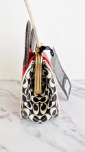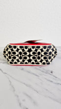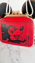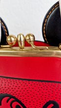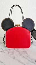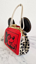 This is the absolutely adorable limited edition kisslock bag in smooth red, chalk and black leather with Mickey Mouse ears from the Coach Disney Mickey Mouse x Keith Haring collection. It features a Keith Haring Mickey Mouse picture on the front and has Coach signature on the sides and bottom. The lining is smooth oxblood leather. It has two large compartments and inside one is a small flat pocket. You can carry it as a handbag with the short handle or as a crossbody or shoulder bag with the long detachable chain crossbody strap. Inside, you will find the Coach creed patch with the style number of the bag on it and the bag has a matching Coach hangtag.