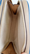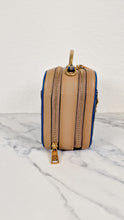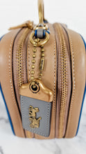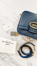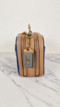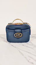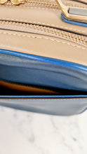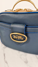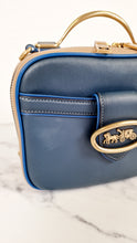 This is the gorgeous Coach 1941 Riley Lunchbox bag in colorblock smooth leather. This adorable bag features a metal top handle and a detachable and adjustable long strap for crossbody wear. It consists of 2 zipped main compartments and has a slip pocket on the front and the back and a snap pocket inside. The main colors are Dark Denim blue and Beechwood with a lighter blue on the 1941 hangtag and a third blue color on the piping. The hardware is brass and the lining is light colored canvas.